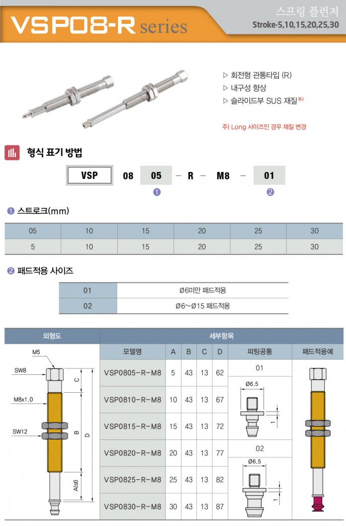 VSP08-R 시리즈 스프링 플런저 / Stroke 5, 10, 15, 20, 25, 30