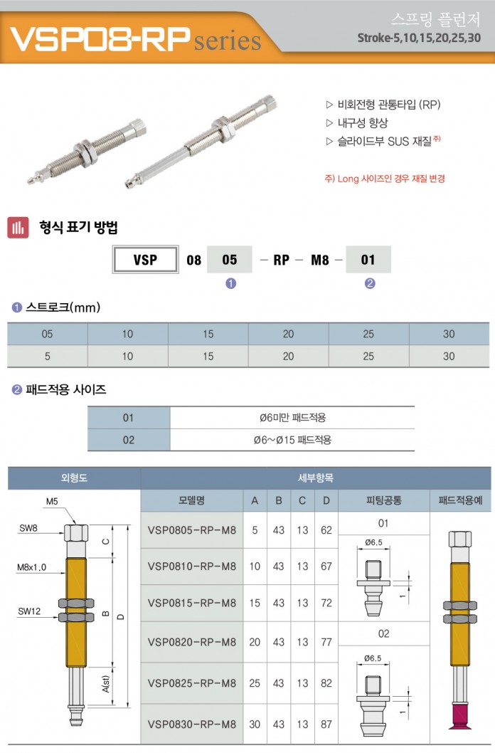 VSP08-RP 시리즈 스프링 플런저 / Stroke 5, 10, 15, 20, 25, 30