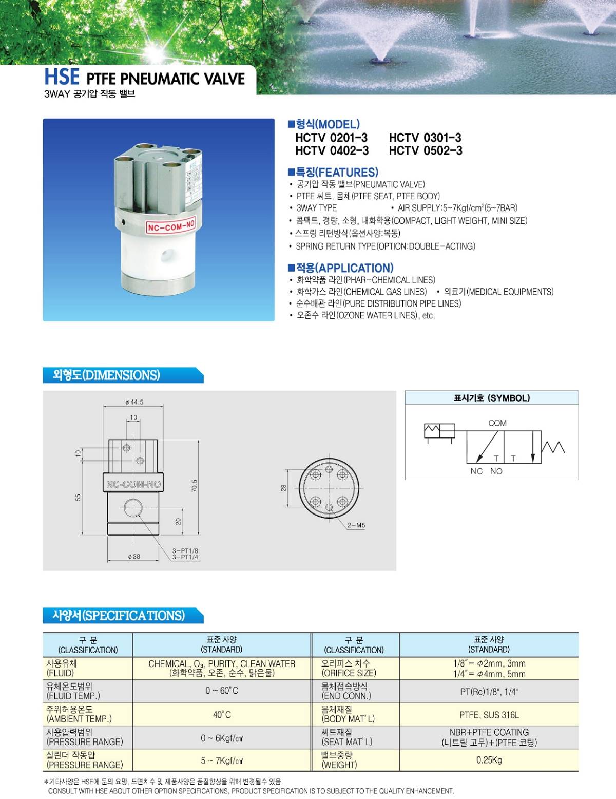 [HCTV-3 시리즈] 3포트 Rc(PT) 1/8, 1/4 몸체&시트 PTFE (화학약품 오존 순수유체 등)