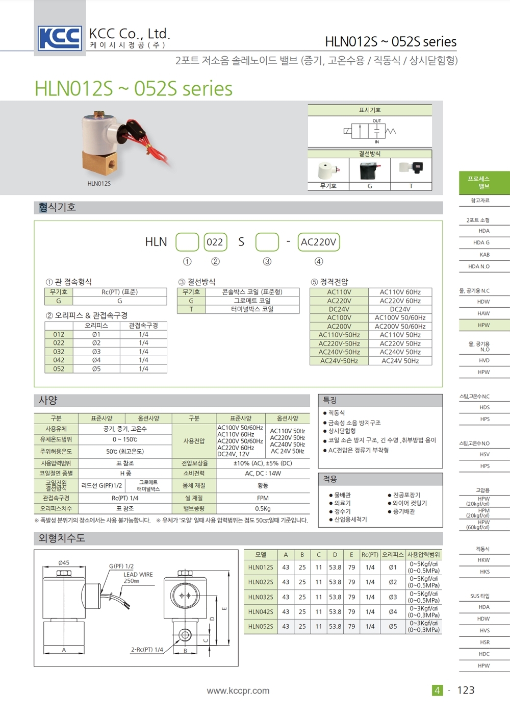 직동식 상시닫힘형 금속성 소음 방지구조 유체사양 따른 시트 재질 변경 가능 코일 소손 방지 구조, 긴 수명, 취부방법 용이 AC 전압 정류기 부착형 |