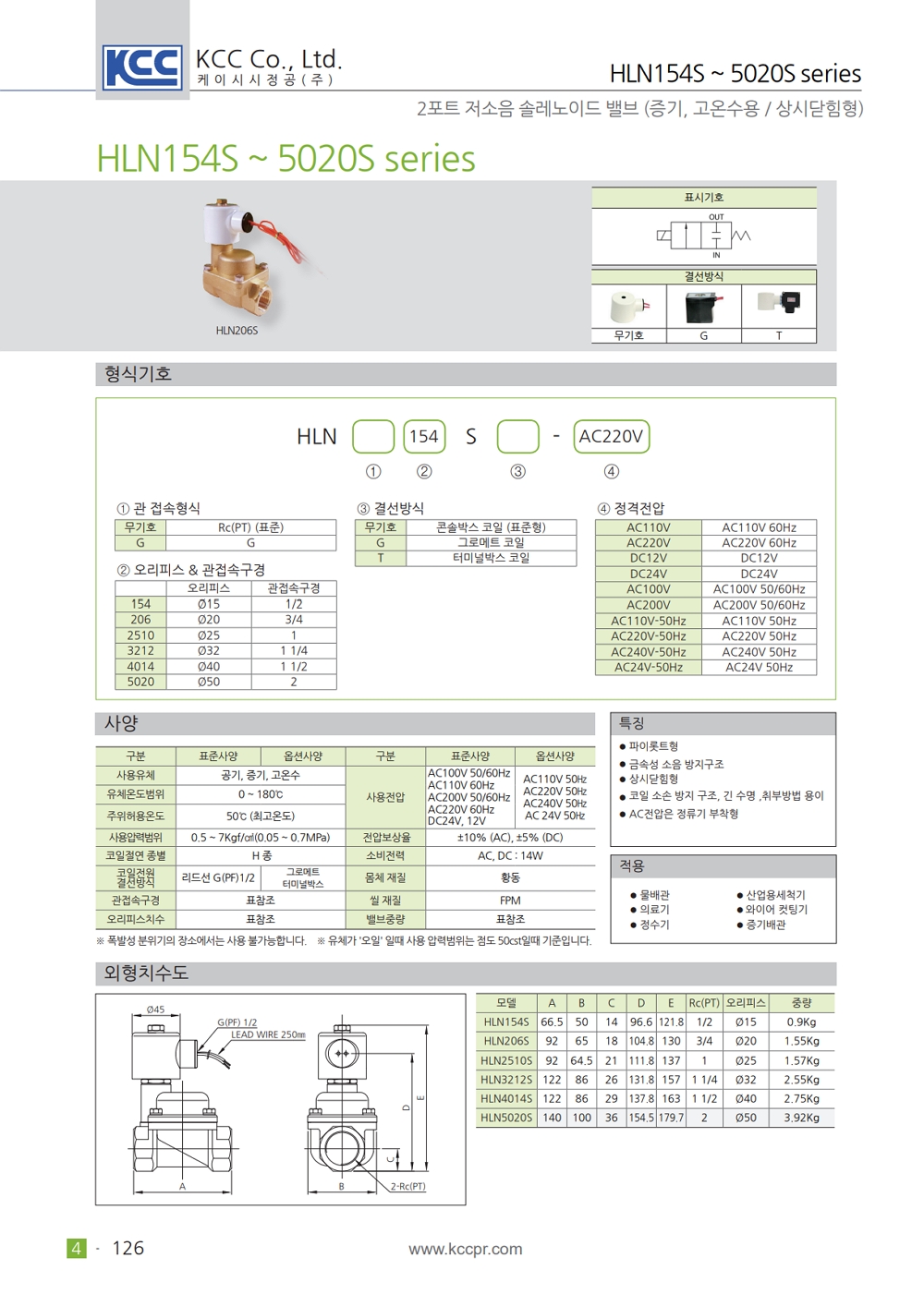 파이롯트식 상시닫힘형 0.5 ~ 7 kgf/cm2 (~ 0.7 Mpa) 금속성 소음 방지구조 유체사양 따른 시트 재질 변경 가능 코일 소손 방지 구조, 긴 수명, 취부방법 용이 AC 전압 정류기 부착형 |