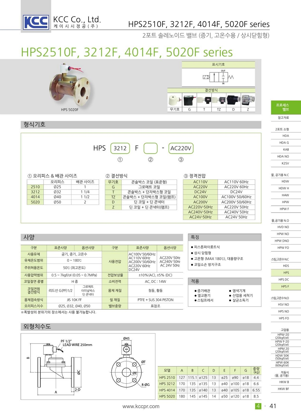 플랜지 타입 JIS 10K FF 피스톤 파이롯트식 상시닫힘형 고온형 max 180도 최소작동차압 0.5kgf/cm2 (입구>출구) 필요 코일 소손 방지 구조 및 긴 수명 |
