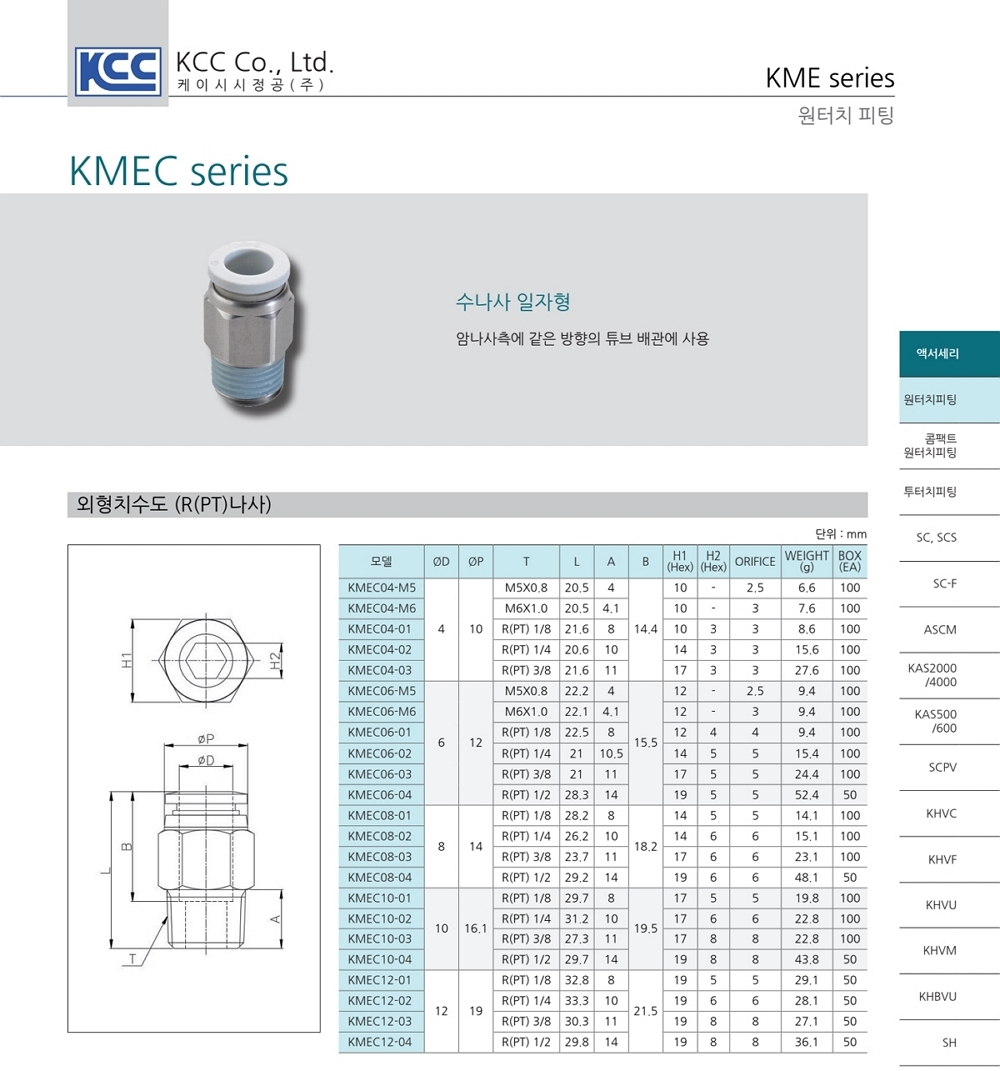 기존 피팅대비 소형화(25%감소), 경량화(45%감소) 되었습니다. 한번의 동작으로 튜브를 밀어넣어 손쉽게 탈착할 수 있습니다. 나사부에는 오링 및 테프론 처리가 되어 있습니다. 사용압력 20kgf/cm2까지 사용 가능합니다. 80℃까지 사용 가능합니다. |
