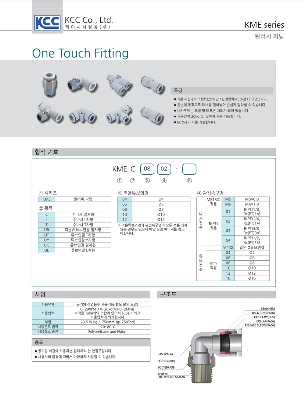 기존 피팅대비 소형화(25%감소), 경량화(45%감소) 되었습니다. 한번의 동작으로 튜브를 밀어넣어 손쉽게 탈착할 수 있습니다. 나사부에는 오링 및 테프론 처리가 되어 있습니다. 사용압력 20kgf/cm2까지 사용 가능합니다. 80℃까지 사용 가능합니다. |