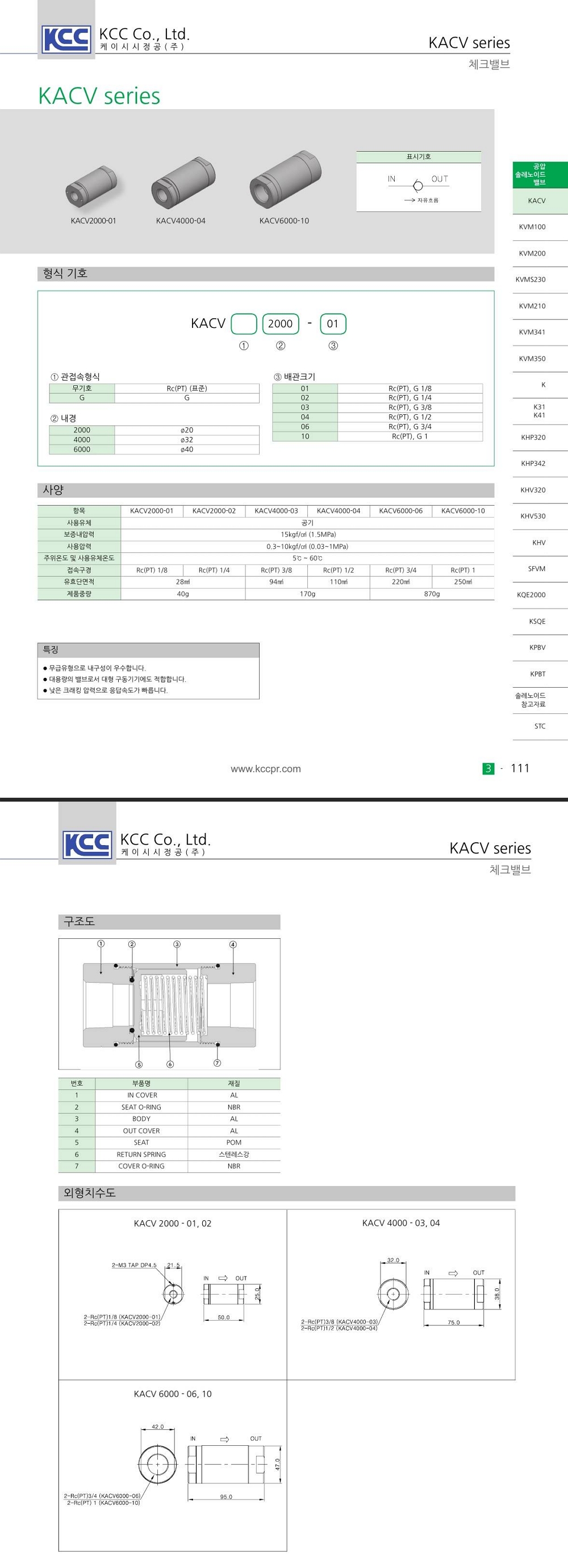 KACV 시리즈 Rc(PT) 1/8, 1/4, 3/8, 1/2, 3/4, 1 인치 체크밸브 무급유