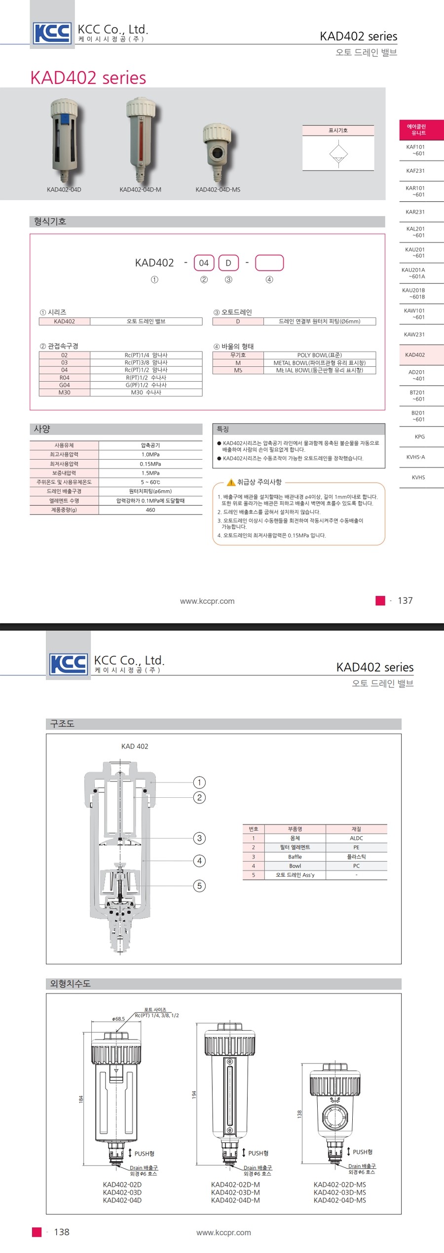 KAD402 시리즈 응축수 자동 배출 원터치피팅(ø6), 1/4~1/2(15A) M30, 0.15~1.0MPa 수동조작배출가능
