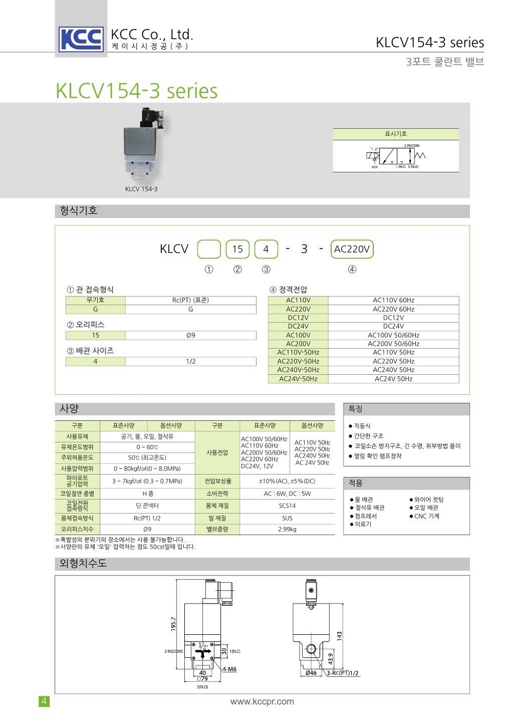 KLCV154-3 시리즈 3포트 암나사 Rc(PT) 1/2, max 80 kgf/cm2