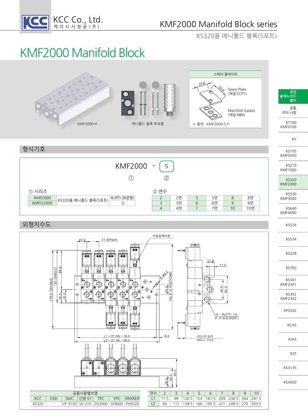 KMF2000 시리즈 KS320 용 매니폴드 블록 Rc(PT) 1/4 (1~10연)