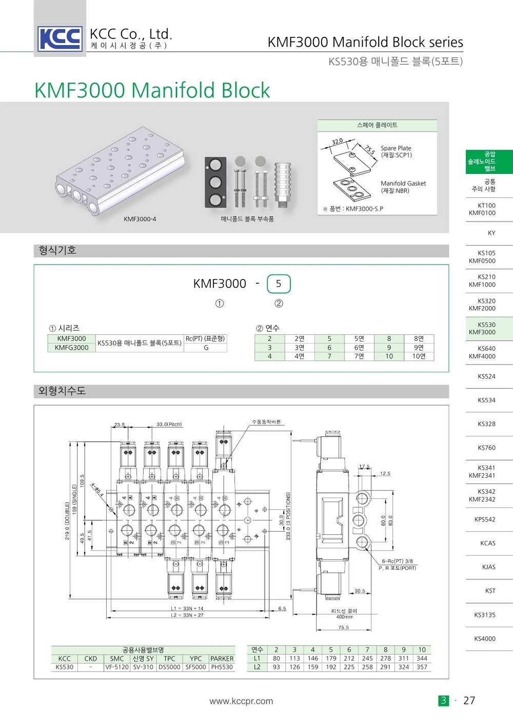 KMF3000 시리즈 KS530 용 매니폴드 블록 Rc(PT) 3/8 (1~10연)
