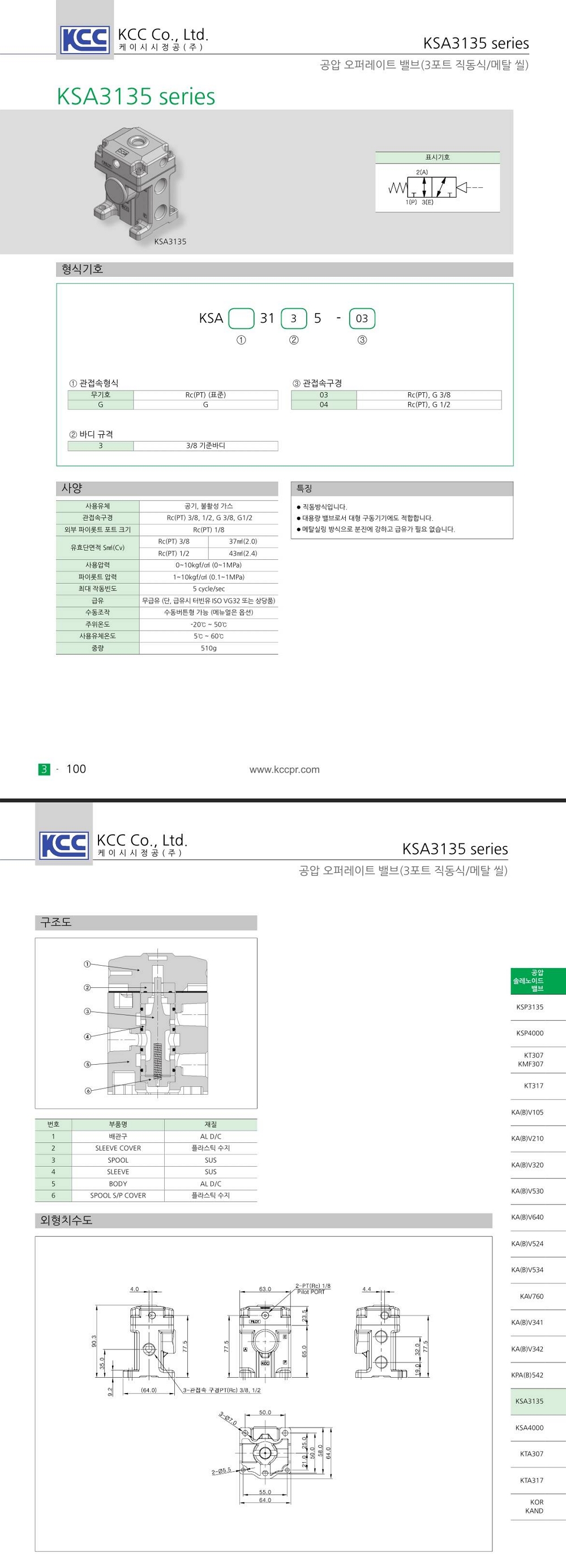 KSA3135 시리즈 대용량 3포트 직동 메탈씰 Rc(PT) 3/8, 1/2