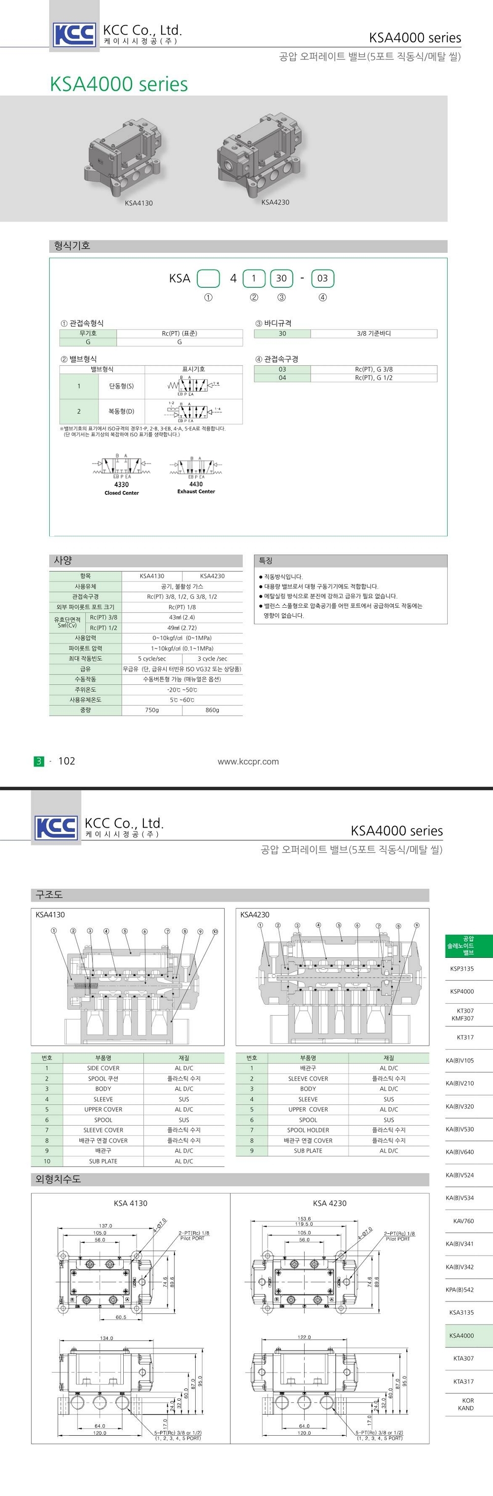 KSA4130 4230 4330 시리즈 대용량 5포트 직동 메탈씰 Rc(PT) 3/8, 1/2