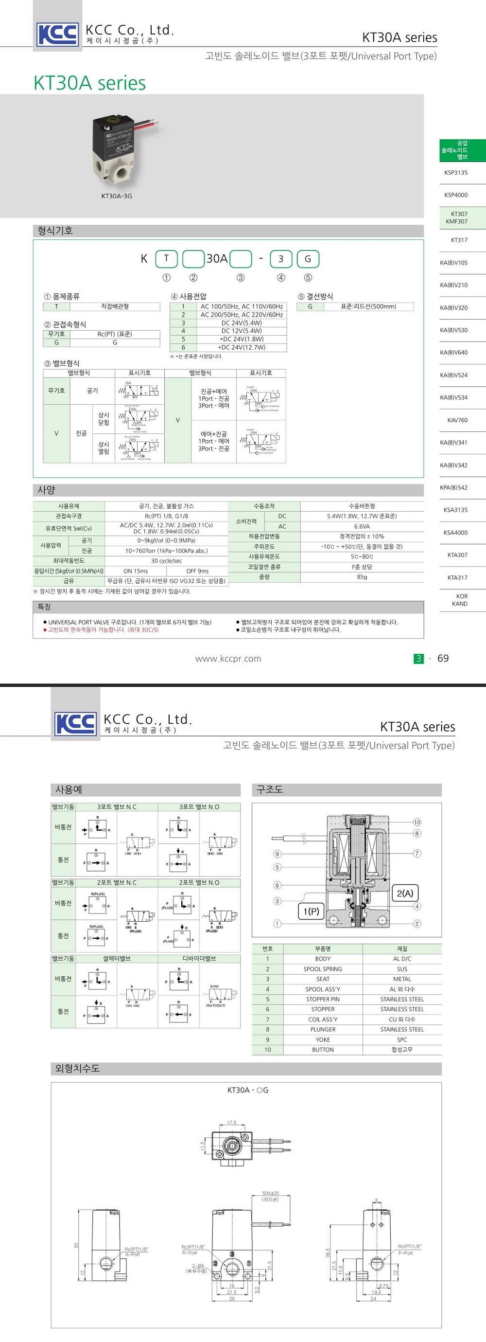 KT30A 시리즈 고빈도 솔레노이드 밸브 3포트 포펫 Rc(PT) 1/8 유니버셜 포트타입