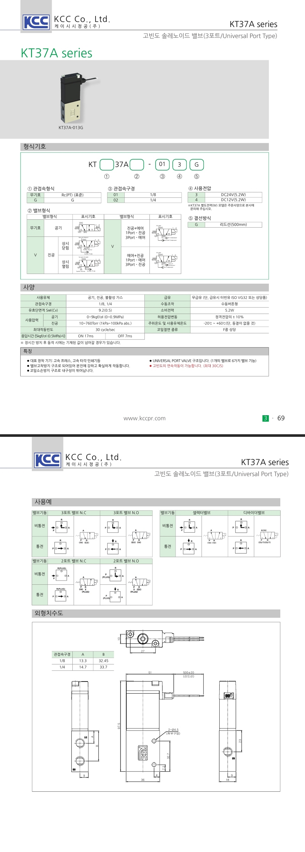 KT37A 시리즈 고빈도 솔레노이드 밸브 Rc(PT) 1/8 1/4 정압/진공 3포트 포펫/유니버셜 포트타입