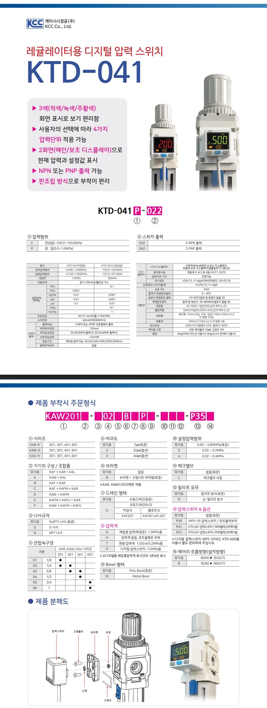KTD-041 시리즈 3색(적/녹/주황) 화면 표시로 보기 편리함 사용자 선택에 따라 4가지 압력단위 적용 가능 2화면(메인/보조 디스플레이)로 현재 압력과 설정값 표시 NPN 또는 PNP 출력 가능 핀조립 방식으로 부착이 편리 |