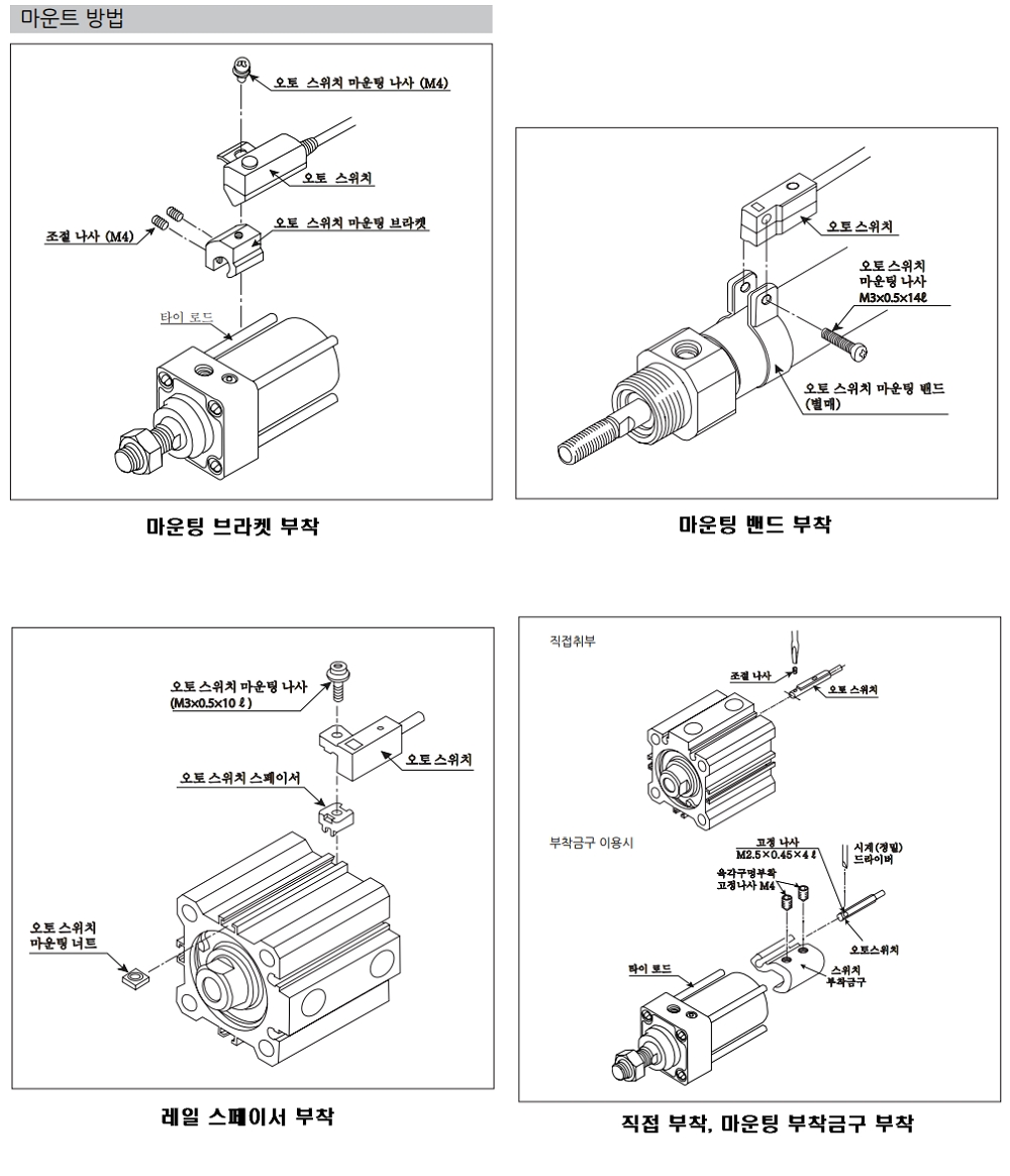 오토스위치 사용 시, 실린더 본품과 연결할 마운트 브라켓 또는 밴드 부착금구입니다.