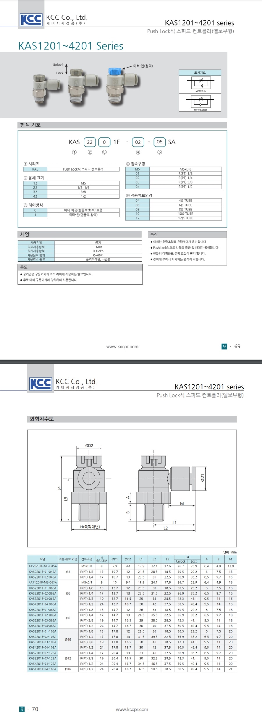 KAS 시리즈 L자형 Push Lock 타입 / 튜브(metric) - 나사R(PT)