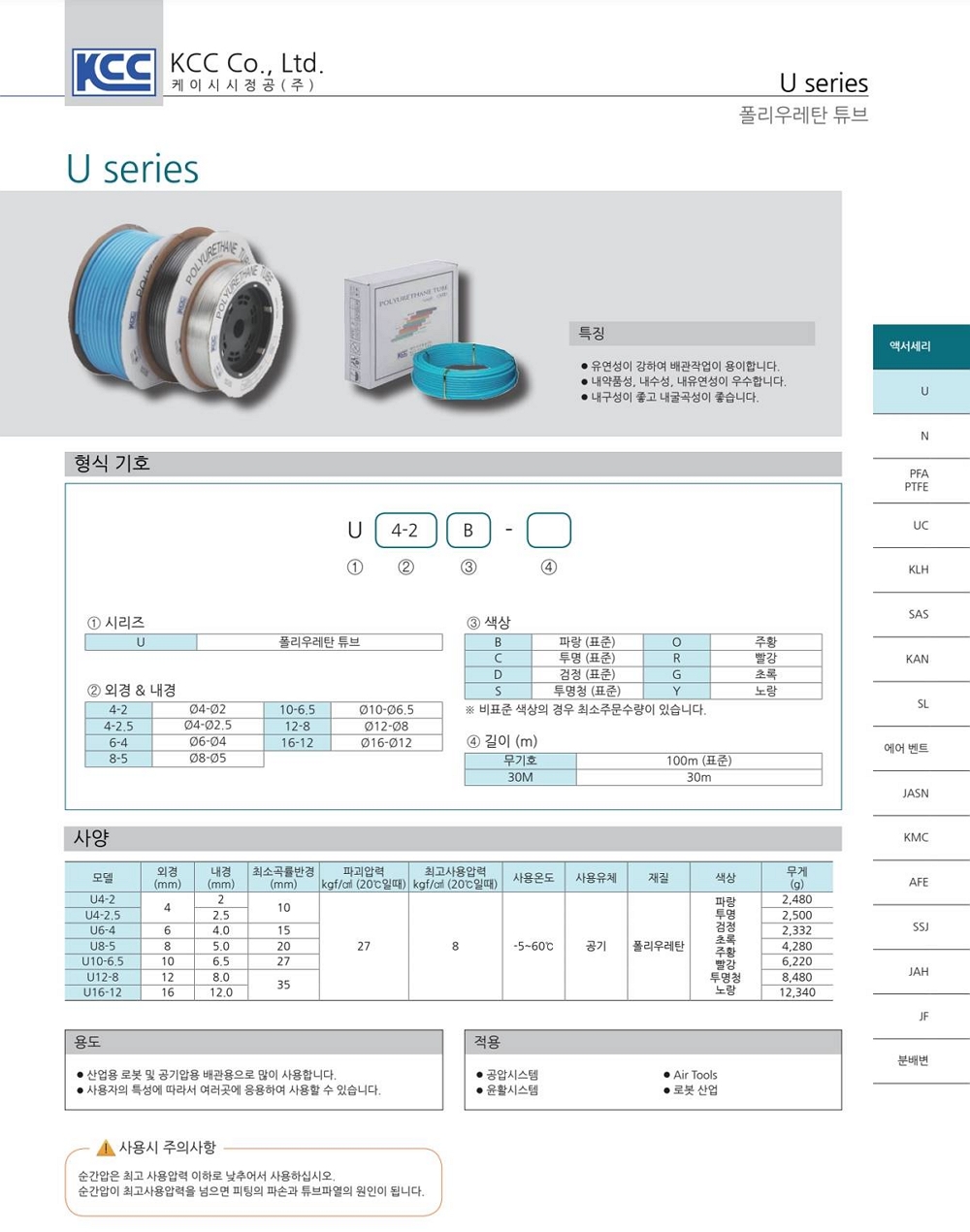 | 체크포인트 | 순간압은 최고 사용압력 이하로 낮추어서 사용하십시오. (피팅 파손과 튜브파열 원인) 빨강 노랑 초록 주황 등 표준 색상 외 컬러(Color)는 납기일 지연 될 수 있어 사전 확인 후 구매 부탁 드립니다. |