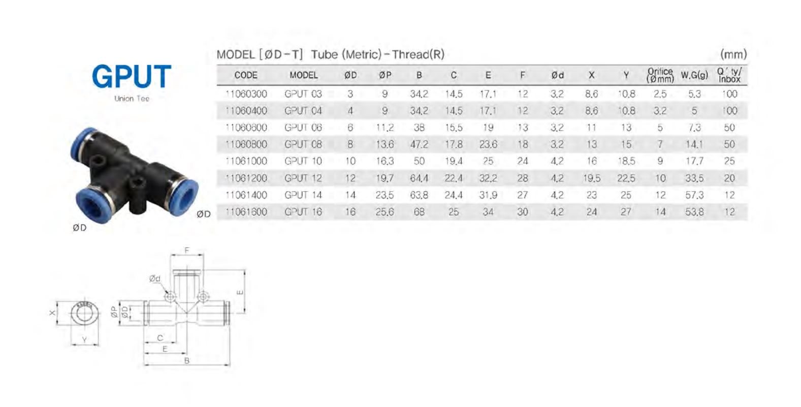 GPUT 튜브연결 T자형 / 튜브(metric)
