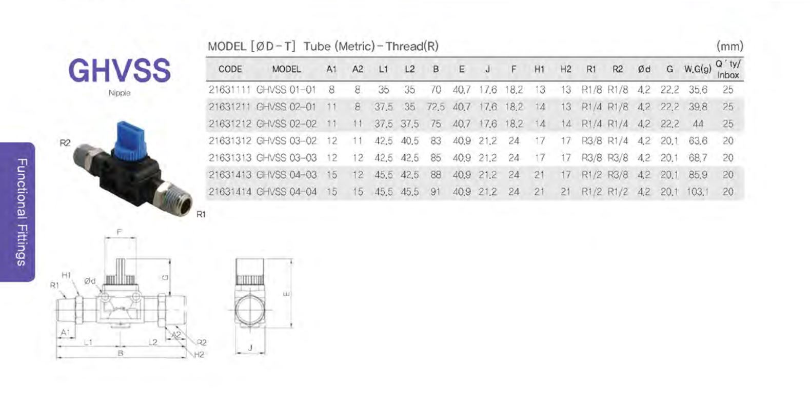| 체크포인트 | - 사용유체 : 공기 - 사용압력 : 0~20kgf/cm² - 부압 : -750mmHg(10Torr) - 사용온도 : 0~80°C - 사용튜브 재질 : Polyurethane and Nylon |