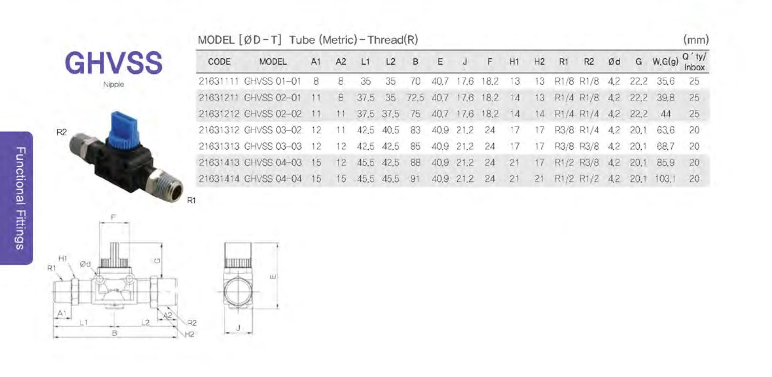 | 체크포인트 | - 사용유체 : 공기 - 사용압력 : 0~20kgf/cm² - 부압 : -750mmHg(10Torr) - 사용온도 : 0~80°C - 사용튜브 재질 : Polyurethane and Nylon |