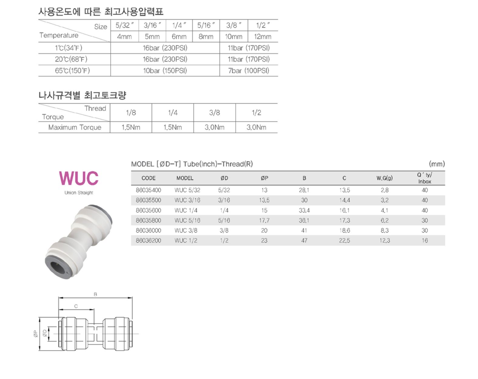| 체크포인트 | - 사용유체 : 물, 식음료 - 사용압력 : 0~16kgf/cm² - 부압 : -750mmHg(10Torr) - 사용온도 : 0~65°C - 사용튜브 재질 : Polyethylene, Polyamide, Polyurethane |