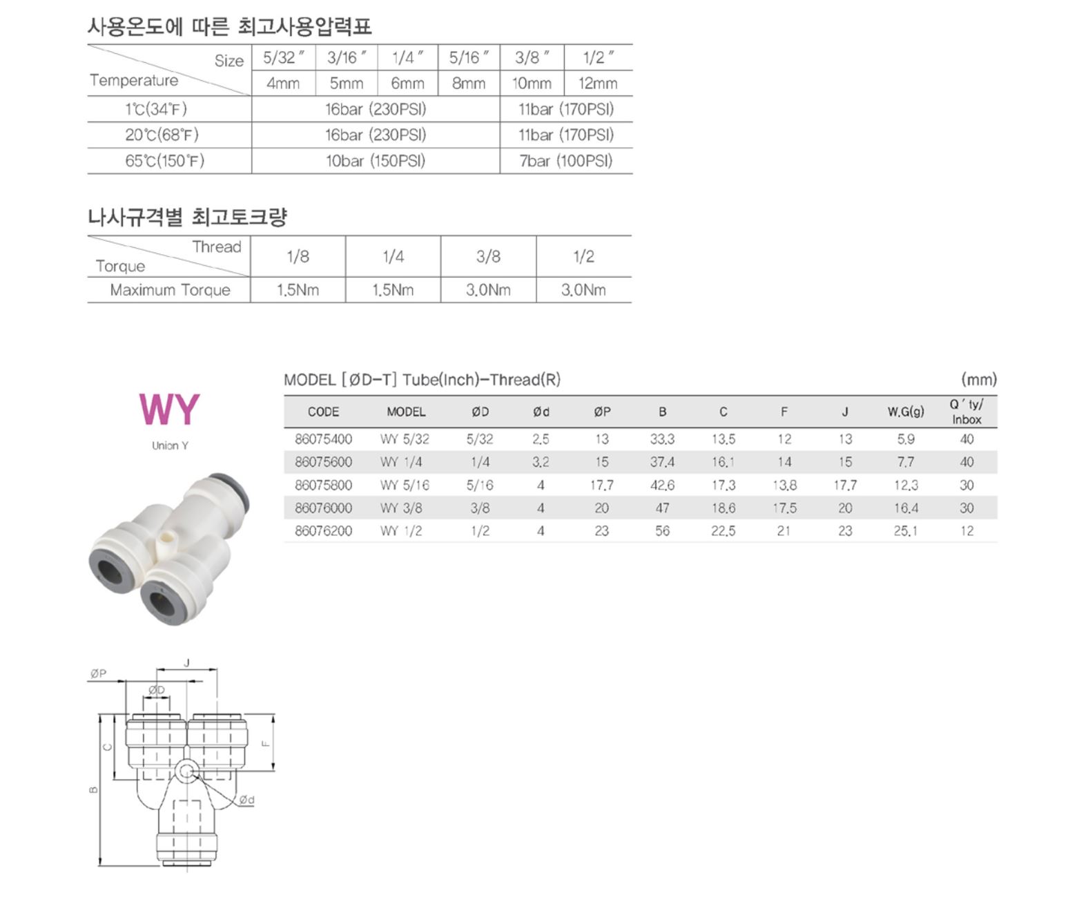 사용압력은 적용 튜브와의 조합에 있어서 튜브의 최고 사용압력에 의거합니다.
