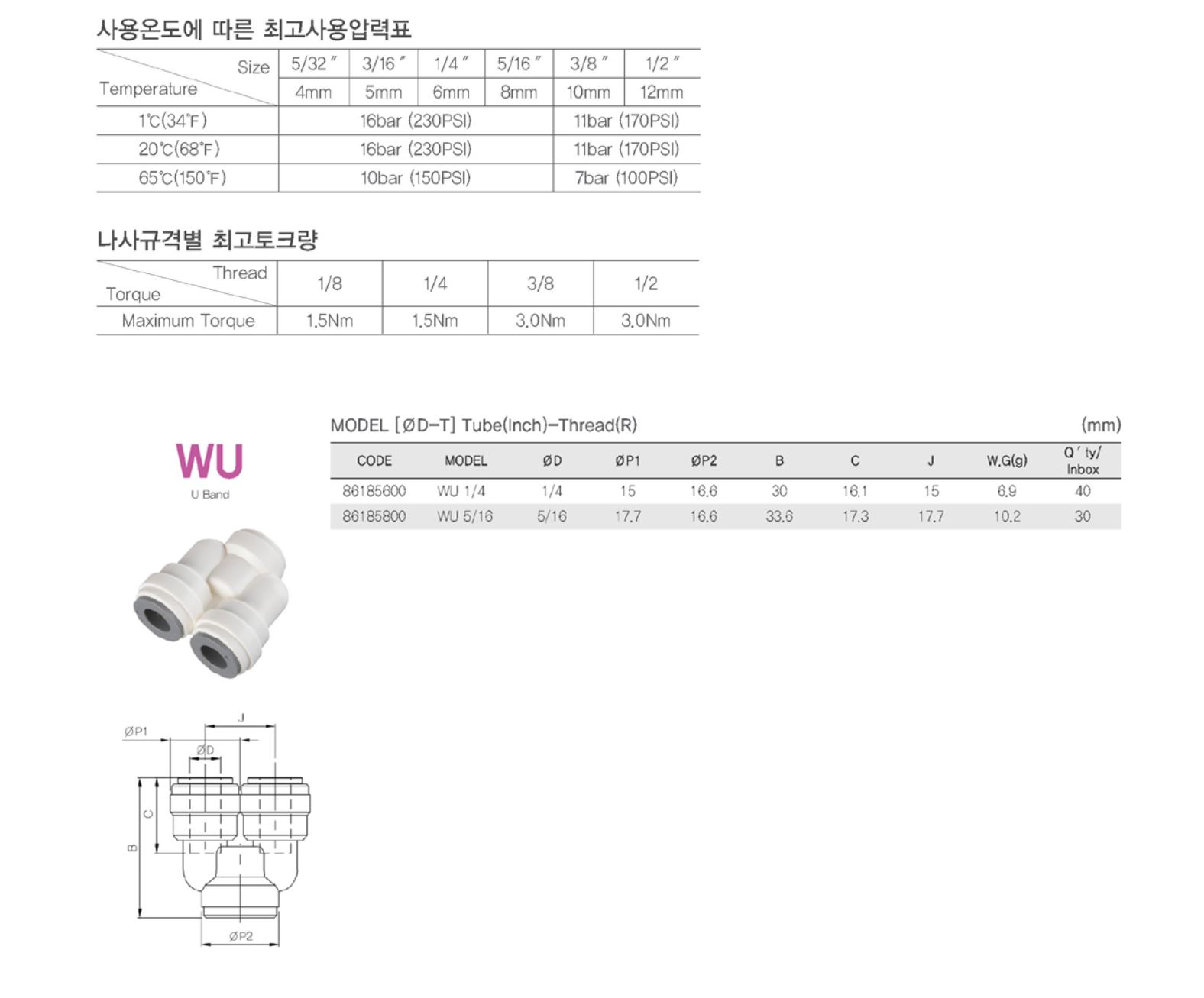 사용압력은 적용 튜브와의 조합에 있어서 튜브의 최고 사용압력에 의거합니다.