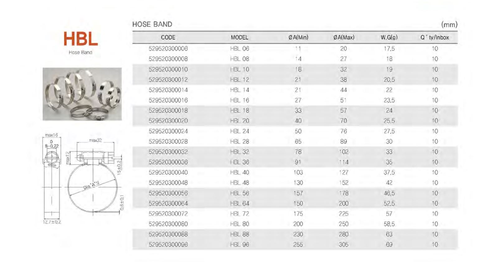 ● 호스 밴드 (Hose Band) 호스 이음 및 누수 방지에 사용합니다. 각종 호스관련 설비에 사용할 수 있습니다. 내식성, 내열성이 강한 Stainless Steel(SUS304)로 제조되어 내구성이 강하며 표면이 영구적으로 깨끗합니다. 밴드 전체가 이중 연마처리되어 호스를 파손시키지 않아 호스의 수명이 깁니다. Stainless Steel로 제조되어 여러 번 사용하여도 마모성이 없습니다. 인장강도가 높아 고열, 고압에서도 누수가 없어 매우 안전합니다. 정밀가공과 최고의 원재료 사용으로 뛰어난 토크량을 가지고 있습니다. 정밀기계로 생산되어 정밀성과 안전성이 뛰어납니다. |