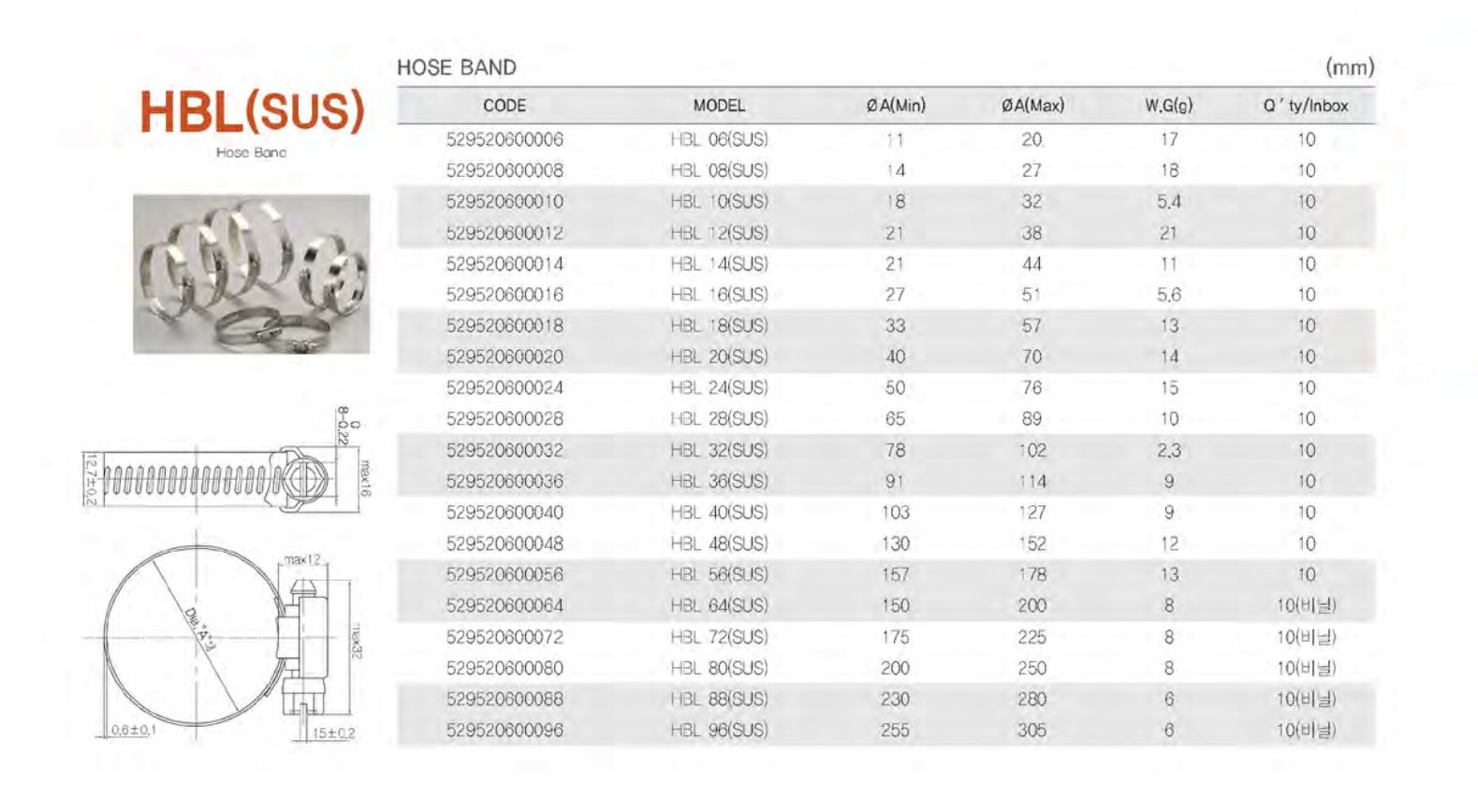 ● 호스 밴드 (Hose Band) 호스 이음 및 누수 방지에 사용합니다. 각종 호스관련 설비에 사용할 수 있습니다. 내식성, 내열성이 강한 Stainless Steel(SUS304)로 제조되어 내구성이 강하며 표면이 영구적으로 깨끗합니다. 밴드 전체가 이중 연마처리되어 호스를 파손시키지 않아 호스의 수명이 깁니다. Stainless Steel로 제조되어 여러 번 사용하여도 마모성이 없습니다. 인장강도가 높아 고열, 고압에서도 누수가 없어 매우 안전합니다. 정밀가공과 최고의 원재료 사용으로 뛰어난 토크량을 가지고 있습니다. 정밀기계로 생산되어 정밀성과 안전성이 뛰어납니다. |