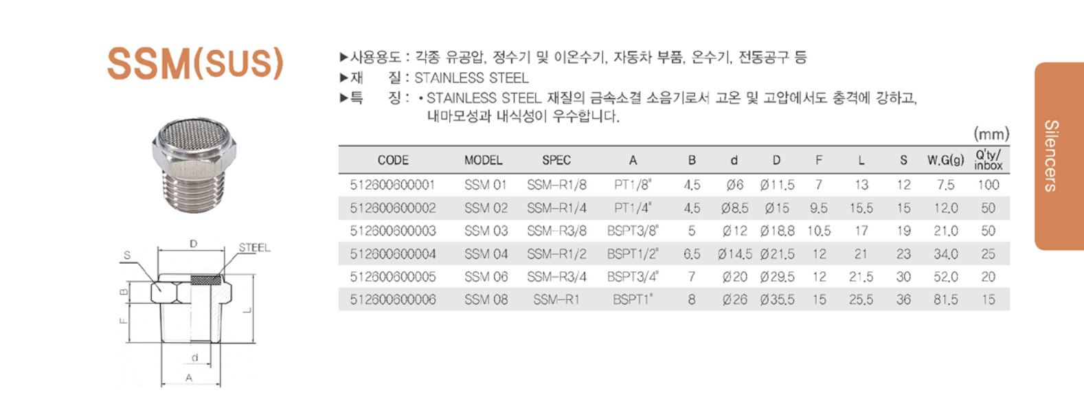 ● 소음기 Silencer 각종 소음이 발생되는 기기의 배기 포트에 설치하여 대기로 배출되는 공기압의 소음을 감소하는데 사용합니다. 소음 효과가 뛰어납니다. 각종 재질에 따라 선택하여 사용이 가능합니다.(BRASS, STAINLESS, STEEL, PLASTIC, AL) 내구성이 오래가며, 사용 장소가 광범위합니다. 콤팩티형이어서 좁은 장소에서도 설치가 가능합니다. |