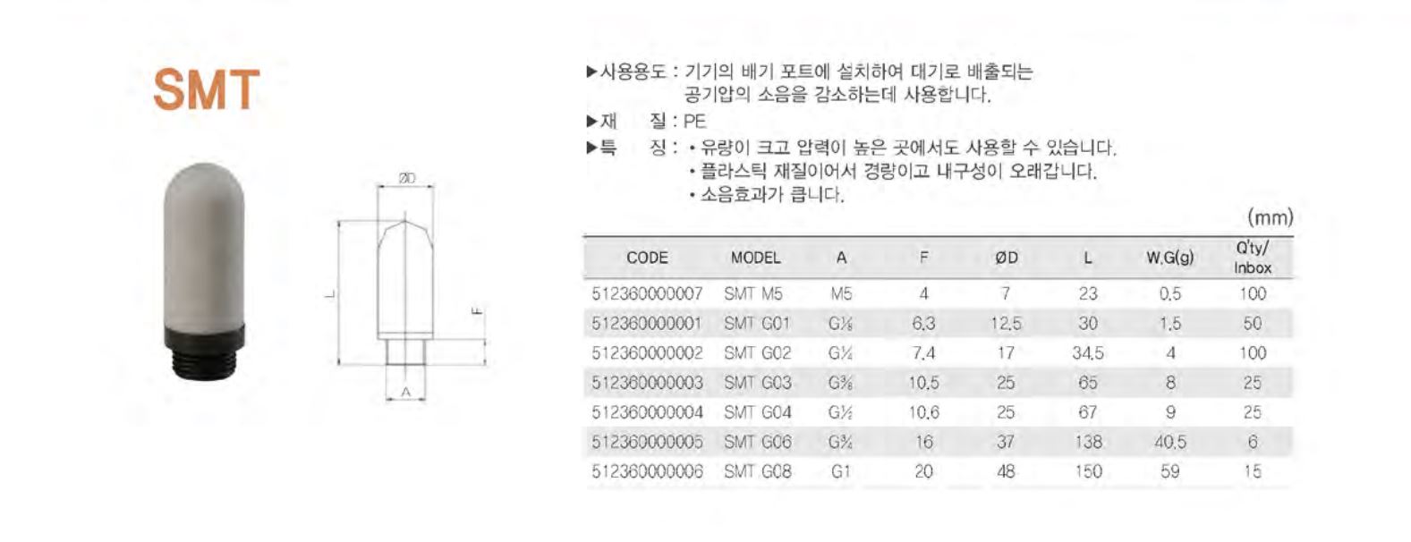 ● 소음기 Silencer 각종 소음이 발생되는 기기의 배기 포트에 설치하여 대기로 배출되는 공기압의 소음을 감소하는데 사용합니다. 소음 효과가 뛰어납니다. 각종 재질에 따라 선택하여 사용이 가능합니다.(BRASS, STAINLESS, STEEL, PLASTIC, AL) 내구성이 오래가며, 사용 장소가 광범위합니다. 콤팩트형이어서 좁은 장소에서도 설치가 가능합니다. |