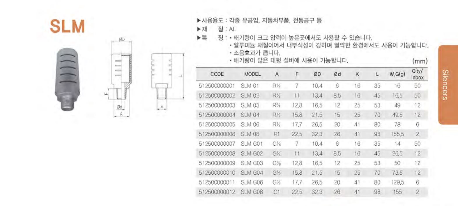 ● 소음기 Silencer 각종 소음이 발생되는 기기의 배기 포트에 설치하여 대기로 배출되는 공기압의 소음을 감소하는데 사용합니다. 소음 효과가 뛰어납니다. 각종 재질에 따라 선택하여 사용이 가능합니다.(BRASS, STAINLESS, STEEL, PLASTIC, AL) 내구성이 오래가며, 사용 장소가 광범위합니다. 콤팩트형이어서 좁은 장소에서도 설치가 가능합니다. |