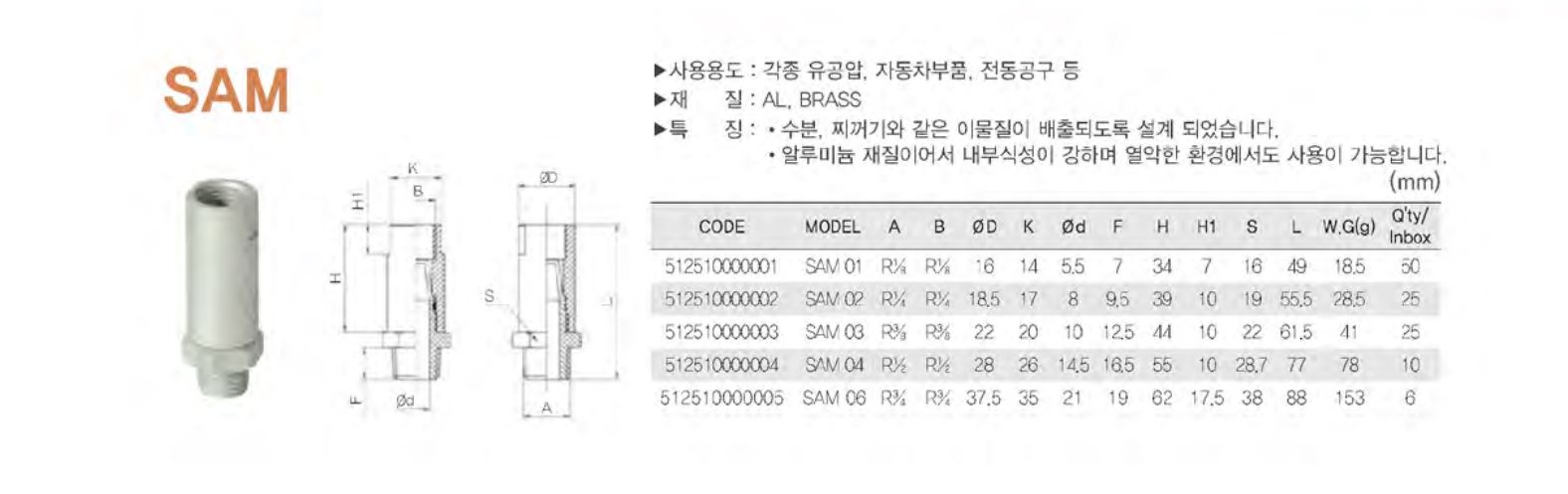 ● 소음기 Silencer 각종 소음이 발생되는 기기의 배기 포트에 설치하여 대기로 배출되는 공기압의 소음을 감소하는데 사용합니다. 소음 효과가 뛰어납니다. 각종 재질에 따라 선택하여 사용이 가능합니다.(BRASS, STAINLESS, STEEL, PLASTIC, AL) 내구성이 오래가며, 사용 장소가 광범위합니다. 콤팩트형이어서 좁은 장소에서도 설치가 가능합니다. |