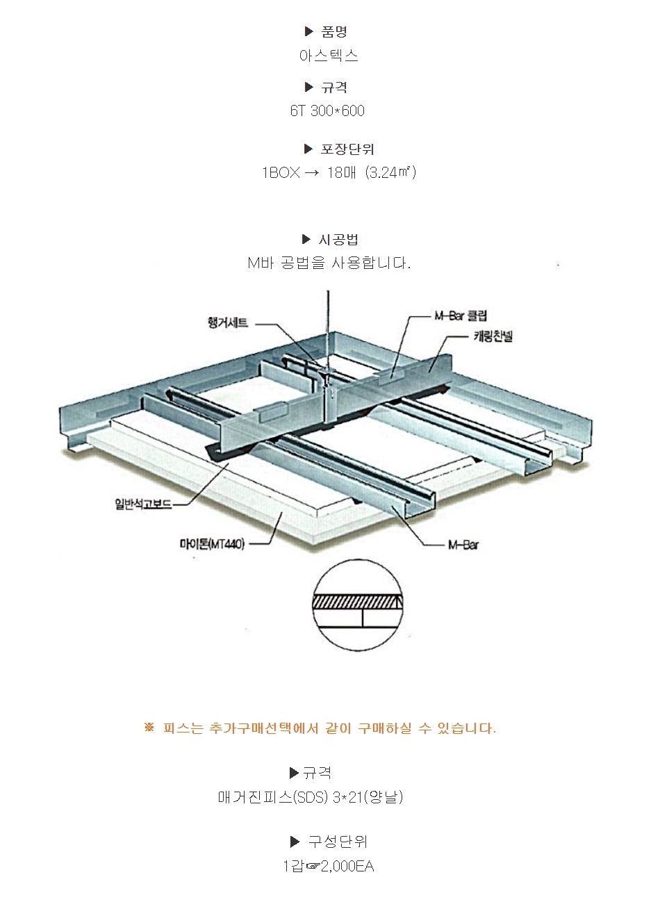 | 체크포인트 | 포장단위 1BOX 18매들이 (3.24mx3.24m) 로 박스출고 상품입니다. M바 공법 사용하여 시공합니다. 매거진 피스(SDS) 3*21(양날) 사용 권장합니다. |
