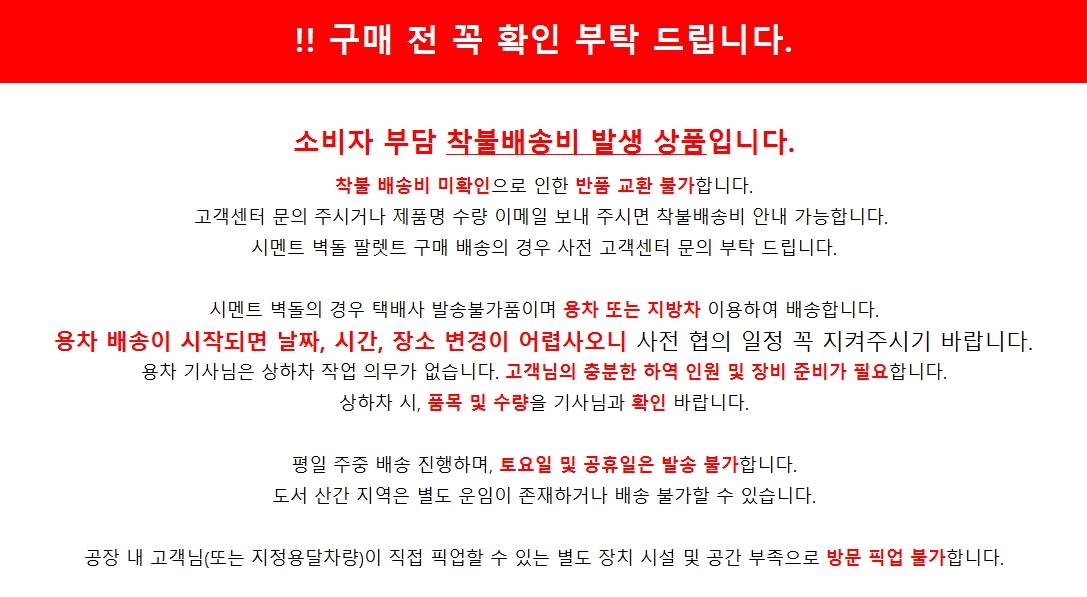 | 체크포인트 | 팔렛트 배송의 경우 사전 고객센터로 문의 바랍니다. 팔렛트 비용은 제품가 포함 되어 있습니다. |