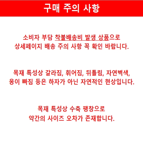 | 안내사항 | * 건축자재 특성상 교환 반품 불가하오니 충분히 사양 및 제원 검토 후 선정 부탁 드립니다. * 제품 이상이 있거나 문제 발생 시 고객센터로 문의 바랍니다. * 목자재 (길이, 부피, 무게에 따라 배송 방법과 비용 산정) 상품의 특성상 택배 발송 불가품이며, 고객님 배송 부담 착불 상품입니다. |