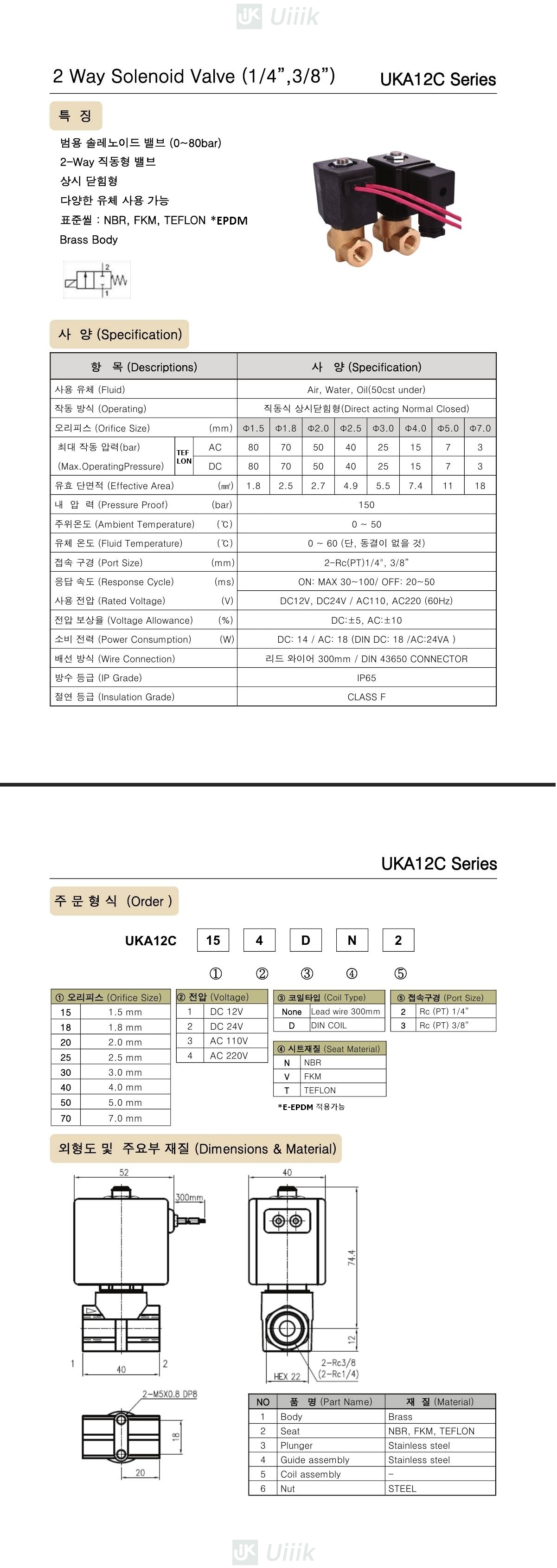 [UKA12C 시리즈] Max 80bar (Teflon 씰) 소형 직동식 1/4 (8A), IP65 리드와이어 코일 + 옵션 딘코일