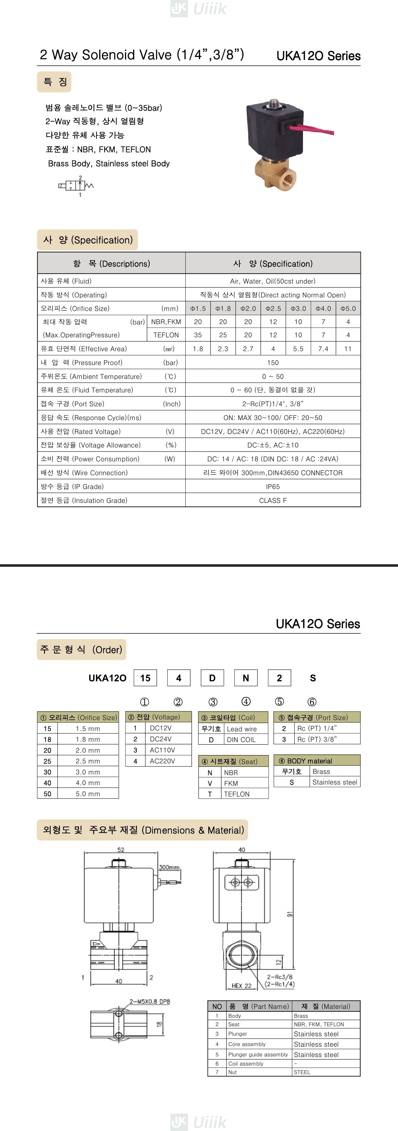 [UKA12O 시리즈] 소형 3/8 (10A) 직동식, Teflon 씰 / IP65 리드와이어 코일 + 옵션 딘코일