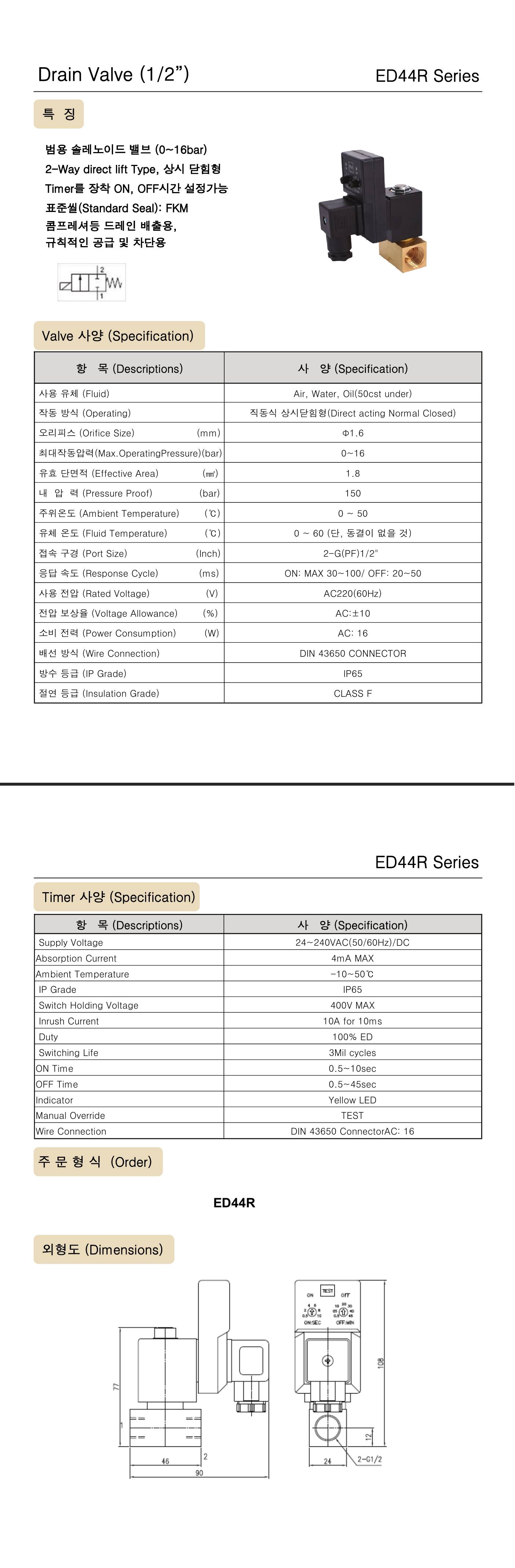 범용 솔레노이드 밸브 (0~16 bar) 2-Way 다이렉트 리프팅 타입, 상시 닫힘형 타이머 장착 ON, OFF 시간 설정가능 적용씰 FKM(표준) 콤프레셔등 드레인 배출용, 규칙적인 공급 및 차단용 |