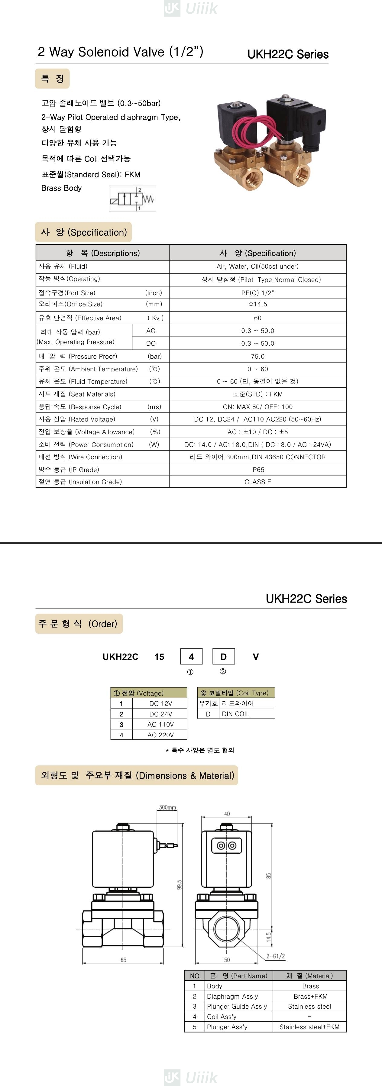 물 공기 기름 황동 FKM 1/2 (15A) 14.5 DC24V min 0.3 max 50 리드와이어 3일 UKH22C002