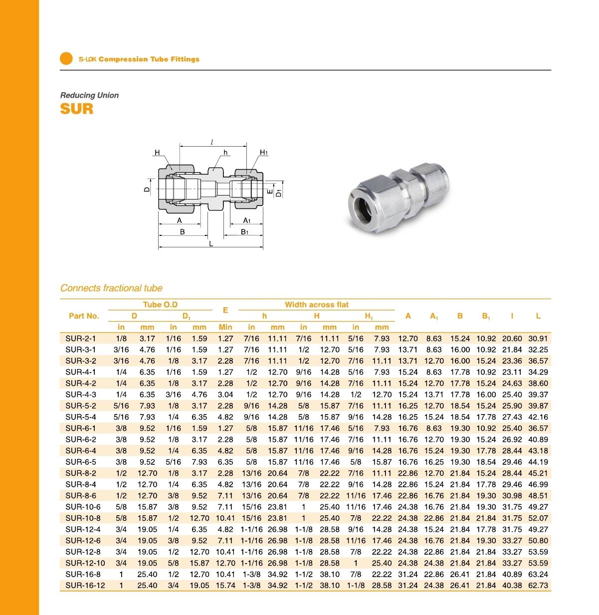 SUR 시리즈 레듀싱 유니온 / 튜브 외경(D) inch X 튜브 외경(D1) inch