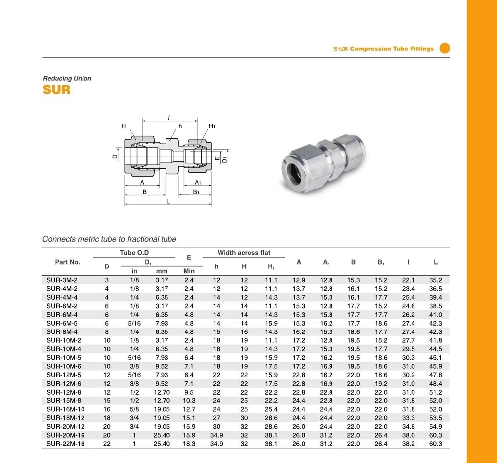SUR 시리즈 레듀싱 유니온 / 튜브 외경(D) mm X 튜브 외경(D1) inch