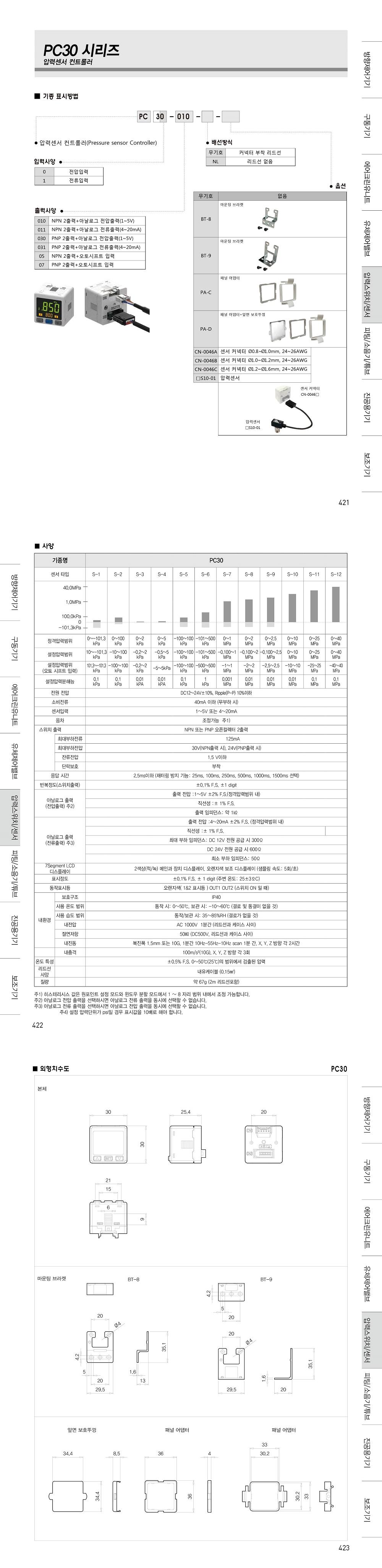 2화면 3색 표시 디지털 LCD 디스플레이 2단 디스플레이로 설정값 표시 가능 키 잠금 표시등 프로그램 가능한 압력 단위 (kPa, MPa, kgf/㎠, bar, psi, inHg, mmHg) 아날로그 출력: 1~5V 또는 4~20mA 센서 입력: 1~5V 또는 4~20mA 12가지 압력 범위를 변환 |
