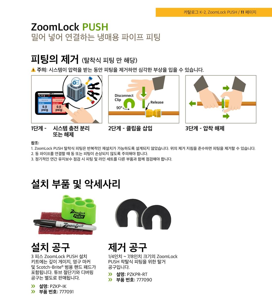 줌락 푸쉬 ZoomLock PUSH 설치 제거 공구 - 반복적인 재설치가 가능하도록 설계되지 않았습니다. - 제거 지침을 준수하여 피팅을 제거할 수 있도록 합니다. - 동 파이프를 연결할 때 동 또는 피팅이 손상되지 않도록 주의해야 합니다. - 정기적인 연간 유지보수 점검 시, 피팅 및 라인 세트를 다른 부품과 함께 점검해야 합니다. |